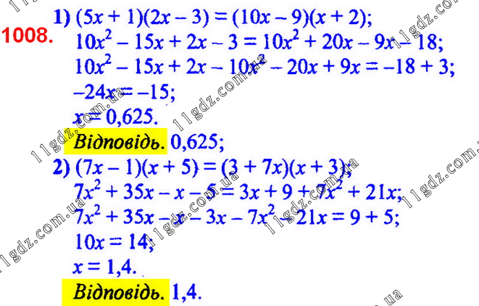 Розв’яжіть рівняння: 1) (5x + 1) (2x – 3) = (10x – 9) (x + 2); 2) (7x – 1) (x + 5) = (3 + 7x) (x + 3).
