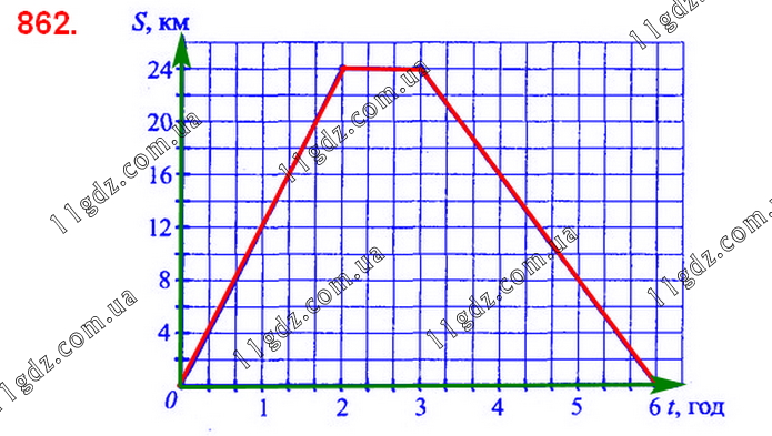 Велосипедистка виїхала з дому на прогулянку. Перші 2 год вона їхала зі швидкістю 12 км/год, потім відпочивала годину й повернулася додому зі швидкістю 8 км/год. Побудуйте графік руху велосипедистки.