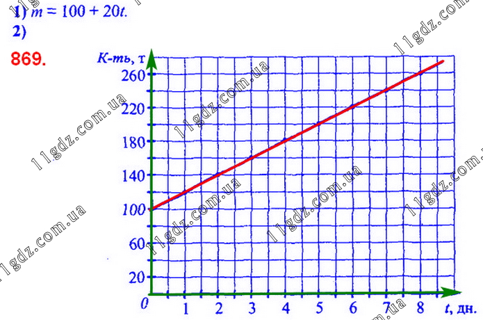На складі було 100 т вугілля. Щодня на склад привозили 20 т вугілля. 1) Виразіть формулою залежність кількості m вугілля на складі від часу t. 2) Накресліть графік цієї залежності.
