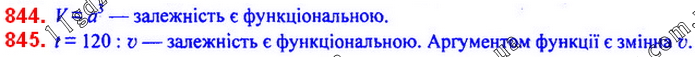 Нехай a — довжина ребра куба, V — його об’єм. Задайте фор- мулою залежність змінної V від змінної a. Чи є ця залежність функціональною? 845.° Автомобіль проїхав 120 км зі швидкістю v. Якою формулою можна задати залежність часу t, витраченого на поїздку, від швидкості v автомобіля? Чи є ця залежність функціональною? У разі ствердної відповіді вкажіть, яка зі змінних є аргументом відповідної функції.