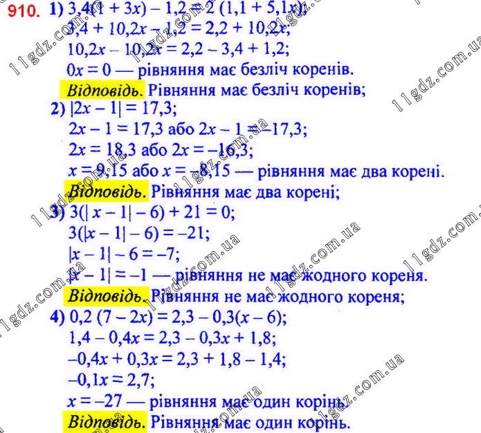 910. Яке з даних рівнянь: а) має один корінь; б) має два корені; в) має безліч коренів; г) не має жодного кореня: 1) 3,4 (1 + 3x) – 1,2 = 2 (1,1 + 5,1x); 2) | 2x – 1 | = 17,3; 3) 3 (| x – 1 | – 6) + 21 = 0; 4) 0,2 (7 – 2x) = 2,3 – 0,3 (x – 6)?
