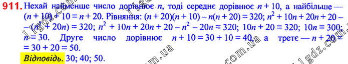 911. Дано три числа, з яких кожне наступне на 10 більше за поперед-нє. Знайдіть ці числа, якщо добуток найбільшого та середнього з них на 320 більший за добуток найбільшого та найменшого із цих чисел.