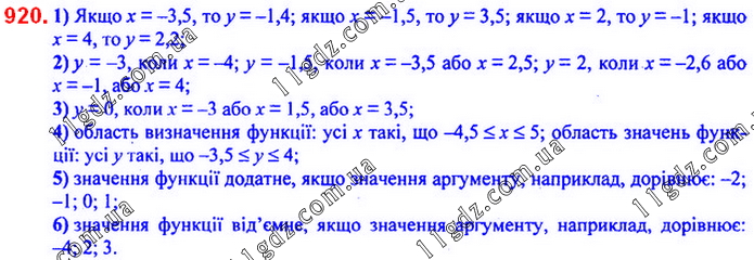 На рисунку 32 зображено графік функції y = f (x). Користуючись графіком, знайдіть: 1) значення y, якщо x = –3,5; –1,5; 2; 4; 2) значення x, яким відповідають значення y = –3; –1,5; 2; 3) значення аргументу, при яких значення функції дорівнюють нулю; 4) область визначення та область значень функції; 5) значення аргументу, при яких значення функції додатні; 6) значення аргументу, при яких значення функції від’ємні.
