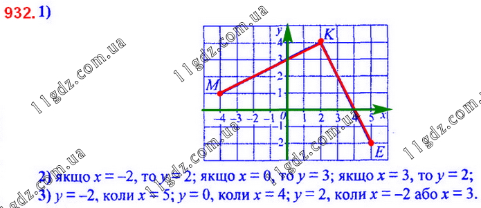Графіком деякої функції є ламана MKE, де M (–4; 1), K (2; 4), E (5; –2). 1) Побудуйте графік даної функції. 2) Знайдіть значення функції, якщо значення аргументу до-рівнює: –2; 0; 3. 3) Знайдіть значення x, при якому y = –2; 0; 2.