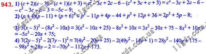 943. Спростіть вираз: 1) (c + 2) (c – 3) – (c + 1) (c + 3); 2) (p ˜ 4) (p °11) ˜ (p ˜ 6)2; 3) 3 (x −5)2 − (8x2 −10x); 4) 7 (2y −5)2 − 2 (7y −1)2.