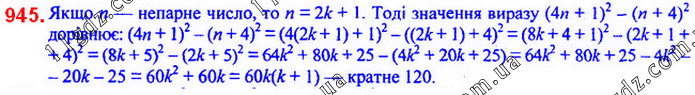 945. Доведіть, що при будь-якому непарному значенні n значення виразу (4n ˜1)2 ° (n ˜ 4)2 кратне 120.