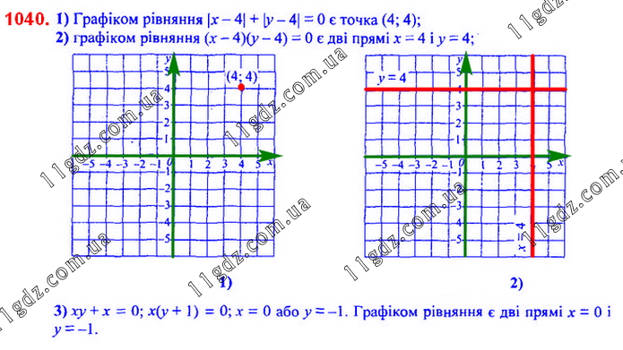 Побудуйте графік рівняння: 1) | x – 4 | + | y – 4 | = 0; 2) (x – 4) (y – 4) = 0; 3) xy + x = 0.