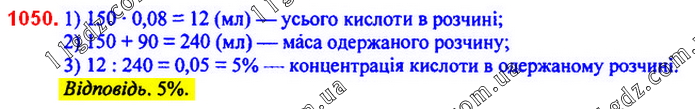 У посудину, яка містить 150 мл 8 %-го розчину кислоти, одали 90 мл води. Чому дорівнює концентрація кислоти в одержаному розчині?