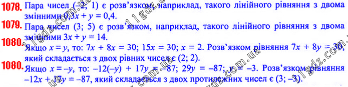 1079.° Складіть яке-небудь лінійне рівняння з двома змінними, розв’язком якого є пара чисел (–2; 1). 1080.° Складіть яке-небудь лінійне рівняння з двома змінними, розв’язком якого є пара чисел (3; 5). 1081.• Знайдіть розв’язок рівняння 7x + 8y = 30, який складається з двох рівних чисел. 1082.• Знайдіть розв’язок рівняння –12x + 17y = –87, який складається з двох протилежних чисел.