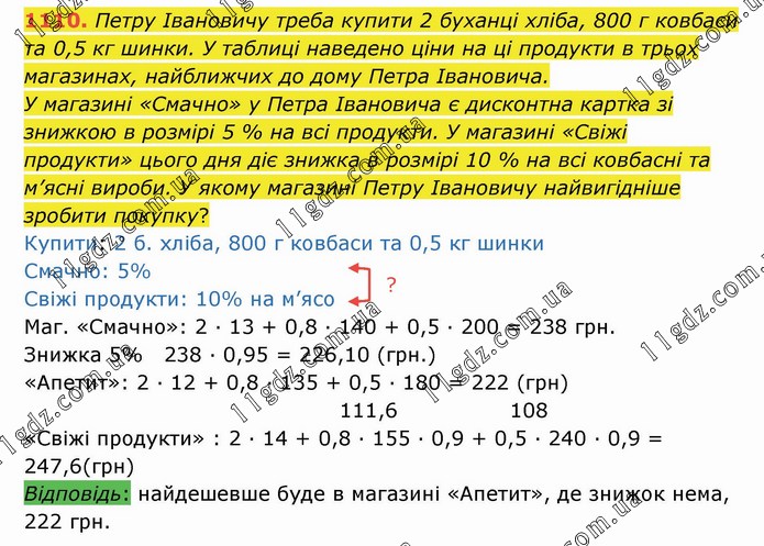 Петру Івановичу треба купити 2 буханці хліба, 800 г ков-баси та 0,5 кг шинки. У таблиці наведено ціни на ці продукти в трьох магазинах, найближчих до дому Петра Івановича. У магазині «Смачно» у Петра Івановича є дисконтна картка зі знижкою в розмірі 5 % на всі продукти. У магазині «Свіжі про-дукти» цього дня діє знижка в розмірі 10 % на всі ковбасні та м’ясні вироби. У якому магазині Петру Івановичу найвигідніше зробити покупку?