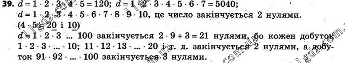 39. Число d є добутком перших n натуральних чисел: d = 1 · 2 · 3 · … · n. Знайдіть d, якщо n = 5; n = 7. Скількома нулями закінчується запис чис-ла d, якщо n = 10; n = 100?