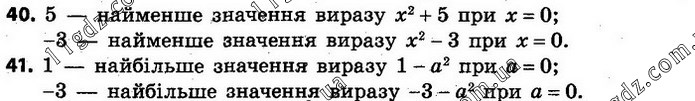 40. Знайдіть найменше значення виразу: х2 + 5; х2 – 3. 41. Знайдіть найбільше значення виразу: 1 – a2; –3 – a2.
