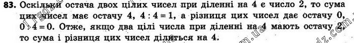 83. Доведіть: якщо два цілі числа при діленні на 4 дають в остачі 2, то сума і різниця цих чисел діляться на 4.
