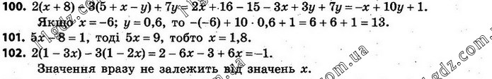 100. Знайдіть значення виразу 2(x + 8) – 3(5 + х – y) + 7y, якщо x = –6; y = 0,6. 101. Для яких значень х значення виразу 5х – 8 дорівнює 1? 102. Доведіть, що значення виразу 2(1 – 3х) – 3(1 – 2х) не залежать від зна-чень х.