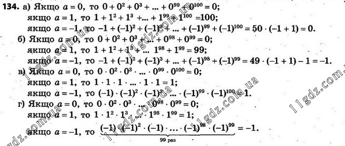134. Знайдіть значення виразу, якщо а = 0; а = 1; а = –1: а) а + а2 + а3 + … + а99 + а100 (ця сума має 100 доданків, кожен з яких є степенем числа а; показники степенів — усі натуральні числа від 1 до 100 включно); б) а + а2 + а3 + … + а98 + а99; в) аа2а3 … а99а100; г) аа2а3 … а98а99.