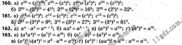 160. а) Подайте z20 у вигляді степеня з основою z2; z4; z5; z10. б) Подайте 220 у вигляді степеня з основою 4; 16; 32. 161. а) Подайте c12 у вигляді степеня з основою с2; с3; с4; с6. б) Подайте 312 у вигляді степеня з основою 9; 27; 81. 162. Подайте у вигляді степеня з основою а: