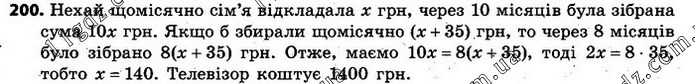 200. Для купівлі нового телевізора сім’я відкладала щомісяця ту саму суму грошей. Після того як через 10 місяців необхідна сума була зібрана, під-рахували: якби щомісяця відкладали на 35 грн більше, то зібрати необ-хідну суму грошей можна було б на 2 місяці раніше. Скільки коштує телевізор?