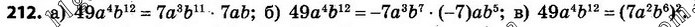 212. Подайте одночлен 49a4b12 у вигляді: а) добутку двох одночленів стандартного вигляду; б) добутку двох одночленів, одним з яких є –7a3b7; в) квадрата одночлена стандартного вигляду.