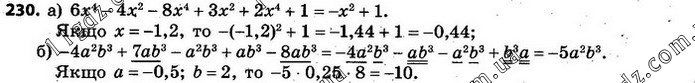 230. а) 6х4 – 4x2 – 8x4 + 3x2 + 2x4 + 1, якщо x = –1,2; б) –4a2b3 + 7ab3 – ab3a + b2ab – 8ab3, якщо a = –0,5; b = 2.