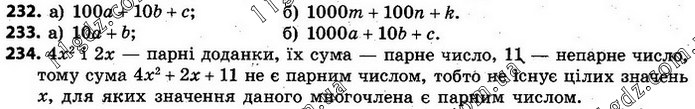 Запишіть у вигляді многочлена число, яке має: 232. а) а сотень, b десятків і с одиниць; б) m тисяч, n сотень і k одиниць. 233. а) а десятків і b одиниць; б) а тисяч, b десятків і с одиниць. 234. Чи існують такі цілі значення х, для яких значення многочлена 4x2 + 2x + 11 є парним числом?