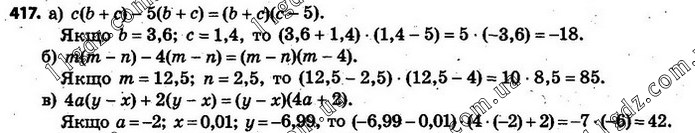 417. Знайдіть значення виразу: а) bc + c2 – 5b – 5c, якщо b = 3,6; c = 1,4; б) m2 – mn – 4m + 4n, якщо m = 12,5; n = 2,5; в) 4ay – 4ax – 2x + 2y, якщо a = –2; x = 0,01; y = –6,99.