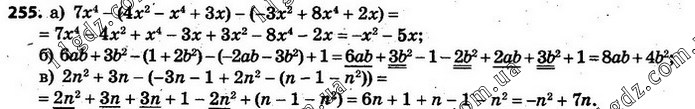 255. а) 7х4 – (4x2 – x4 + 3x) – (–3x2 + 8x4 + 2x); б) 6ab + 3b2 – (1 + 2b2) – (–2ab – 3b2) + 1; в) 2n2 + 3n – (–3n – 1 + 2n2 – (n – 1 – n2)).