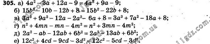 305. a) (a + 3)(4a – 3); в) (a2 + 3a – 4)(3a – 2); д) (a – 6b)(2a – b); б) (5b – 4)(3b – 2); г) (n – m)(n + 4m); е) (4c – 3d)(3c + d).