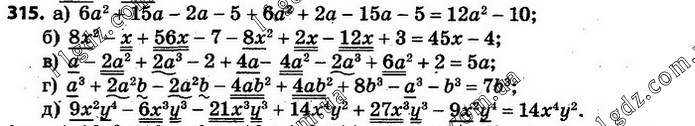 315. а) (3a – 1)(2a + 5) + (2a – 5)(3a + 1); б) (x + 7)(8x – 1) – (2x + 3)(4x – 1); в) (a – 2)(1 – 2a + 2a2) – 2(a3 – 3a2 – 1); г) (a2 – 2ab + 4b2)(a + 2b) – a3 – b3; д) (3xy2 – 7x2y)(3xy2 – 2x2y) + (3xy)3 – (3xy2)2.