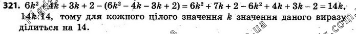 321. (2k + 1)(3k + 2) – (2k – 1)(3k – 2) ділиться на 14.