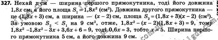 327. Довжина прямокутника в 1,8 разу більша від ширини. Якщо довжину прямокутника збільшити на 3 см, а ширину зменшити на 2 см, то площа зменшиться на 9 см2. Знайдіть довжину і ширину прямокутника.