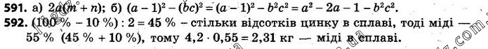 591. Запишіть у вигляді виразу: а) подвоєний добуток змінної а та суми змінних m і n; б) різницю квадратів виразів а – 1 і bc. 592. Маса сплаву міді й цинку дорівнює 4,2 кг. Знайдіть масу міді, якщо її у сплаві на 10% більше, ніж цинку.