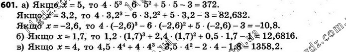 601. а) 4х3 – 6х2 + 5х – 3, якщо х = 5; х = 3,2; х = –2,6; б) 1,2х3 + 2,4х2 + 0,5х – 1, якщо х = 1,7; в) 4,5х4 + 4х3 – 3,5х2 + 2х – 1,8, якщо х = 4.