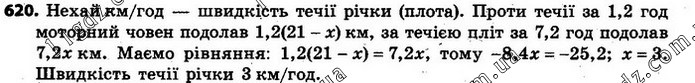 620. Турист деяку відстань проплив моторним човном проти течії річки за 1,2 год, а назад повертався плотом протягом 7,2 год. Знайдіть швидкість течії річки, якщо швидкість човна у стоячій воді дорівнює 21 км/год.