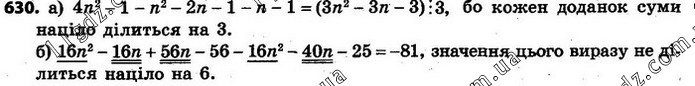 630. Доведіть, що для кожного цілого значення n значення виразу: а) (2n + 1)(2n – 1) – (n + 1)2 – n – 1 ділиться на 3; б) (2n + 7)(8n – 8) – (4n + 5)2 не ділиться на 6.