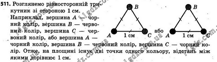 Кожна точка площини має червоний або чорний колір. Доведіть, що на цій площині знайдуться дві точки одного кольору, відстань між якими дорівнює 1 см.