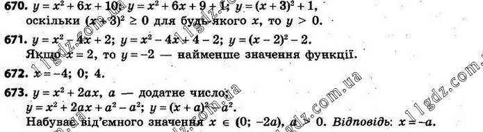 670. Доведіть, що функція y = х2 + 6x + 10 не може набувати від’ємних значень. 671. Знайдіть найменше значення функції y = х2 – 4x + 2. 672. Для яких значень аргументу значення функції y = x2 – 4|x| дорівнюють нулю? 673. Функція задана формулою y = x2 + 2ах, де а — деяке додатне число. Чи набуває ця функція від’ємного значення?