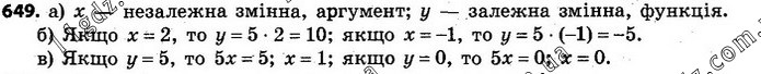 649. Функція задана формулою y = 5x. а) Яка змінна є незалежною, а яка — залежною; яка є аргументом, а яка — функцією? б) Яке значення функції відповідає значенню аргументу х = 2; х = –1?в) Якому значенню аргументу відповідає значення функції у = 5; у = 0?