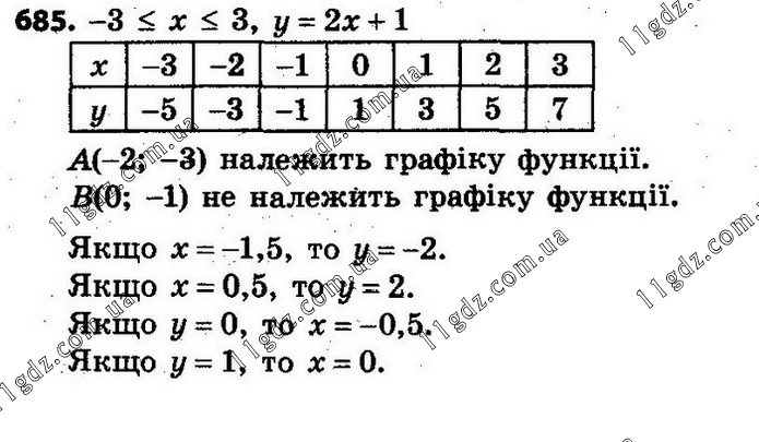 685. Побудуйте графік функції, заданої формулою y = 2x + 1, де –3 ≤ x ≤ 3, склавши таблицю значень функції з кроком 1. Чи належать графіку функції точки A(–2; –3), B(0; –1)? Користуючись графіком, знайдіть: значення функції, якщо х = –1,5; х = 0,5; значення аргументу, якому від-повідає значення функції у = 0; у = 1.