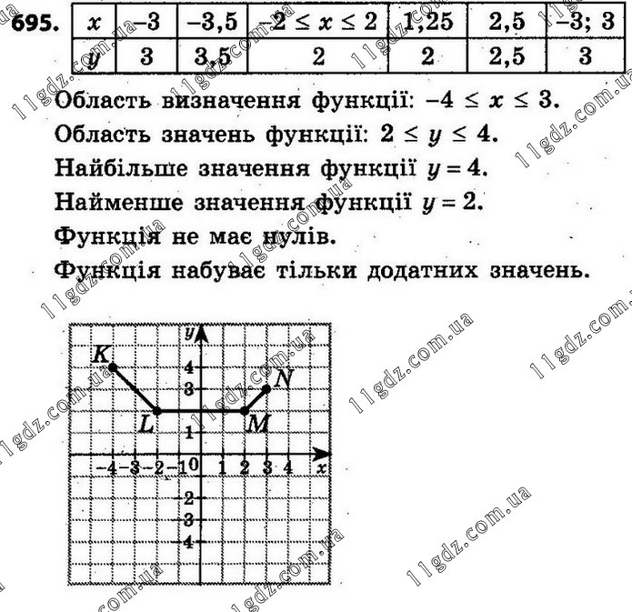 Графіком функції є ламана KLMN, де K(–4; 4), L(–2; 2), M(2; 2), N(3; 3). Накресліть графік функції та заповніть таблицю: Яка область визначення та область значень функції? Чому дорівнюють найбільше та найменше значення функції? Чи має функція нулі? Для яких значень х функція набуває додатних значень; від’ємних значень?