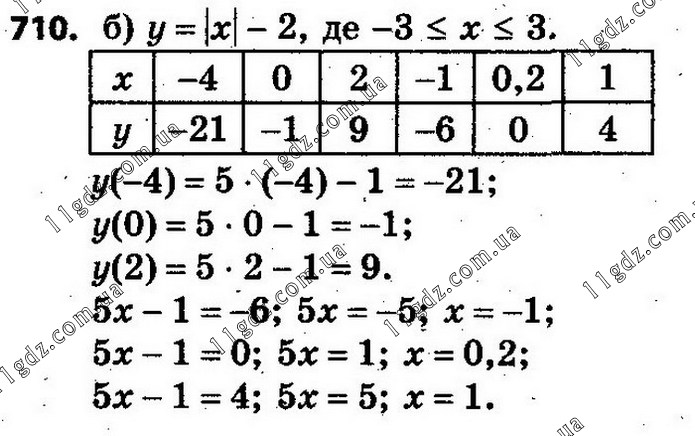 710. Лінійна функція задана формулою у = 5х – 1. Знайдіть значення у, яке відповідає х = –4; х = 0; х = 2. Для яких значень х значення функції до-рівнює –6; 0; 4?