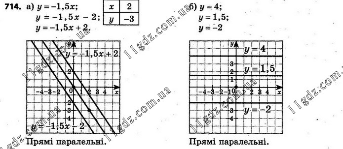 714. а) у = –1,5х; у = –1,5х – 2; у = –1,5х + 2; б) у = 4; у = 1,5; у = –2.