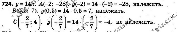 724. Чи належить графіку прямої пропорційності у = 14х точка: A(–2; –28); B(0,5; 7); ?