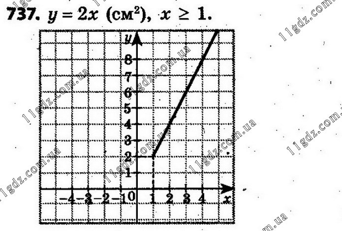 737. Одна сторона прямокутника дорівнює 2 см, а інша — х см, де х ≥ 1. За-пишіть формулу, яка задає залежність площі у прямокутника (у квадрат-них сантиметрах) від х. Побудуйте графік функції, яка задається цією формулою.