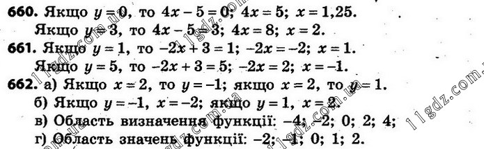 660. Функція задана формулою y = 4x – 5. Для яких значень аргументу зна-чення функції дорівнює 0; 3? 661. Функція задана формулою y = –2x + 3. Для яких значень аргументу зна-чення функції дорівнює 1; 5? 662. Функція задана таблицею: а) Знайдіть значення функції, якщо х = –2; х = 2. б) Для яких значень х значення функції дорівнює –1; 1? в) Яка область визначення функції? г) Яка область значень функції?