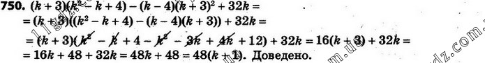 750. Доведіть, що значення виразу (k + 3)(k2 – k + 4) – (k – 4)(k + 3)2 + 32k ділиться на 48 для кожного цілого значення k.