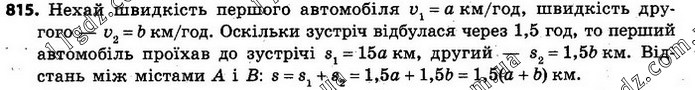 815. З міст А і В одночасно назустріч один одному виїхали два автомобілі й зустрілися через 1,5 год. Швидкість одного автомобіля дорівнює а км/год, а іншого — b км/год. Запишіть у вигляді виразу відстань між містами.