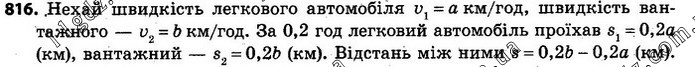 816. Легковий автомобіль наздоганяє вантажний. Швидкість легкового авто-мобіля дорівнює а км/год, а вантажного — b км/год. Запишіть у вигляді виразу відстань між автомобілями за 0,2 год до зустрічі.