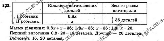 823. Два робітники виготовили 36 деталей, до того ж, кількість деталей, які виготовив перший робітник, становить 0,8 кількості деталей, які вигото-вив другий. Скільки деталей виготовив кожен робітник?