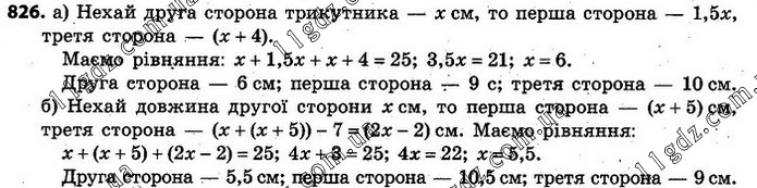 826. Периметр трикутника дорівнює 25 см. Знайдіть довжину кожної сторо-ни трикутника, якщо: а) перша сторона в 1,5 разу довша від другої, а друга — на 4 см коротша від третьої; б) довжина першої сторони на 5 см більша від довжини другої, а довжи-на третьої — на 7 см менша від суми довжин перших двох.