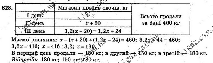 828. Магазин продав за 3 дні 460 кг овочів. За другий день було продано овочів на 20 кг більше, ніж за перший, а за третій — в 1,2 разу більше, ніж за дру-гий. Скільки кілограмів овочів продав магазин за кожний день окремо?
